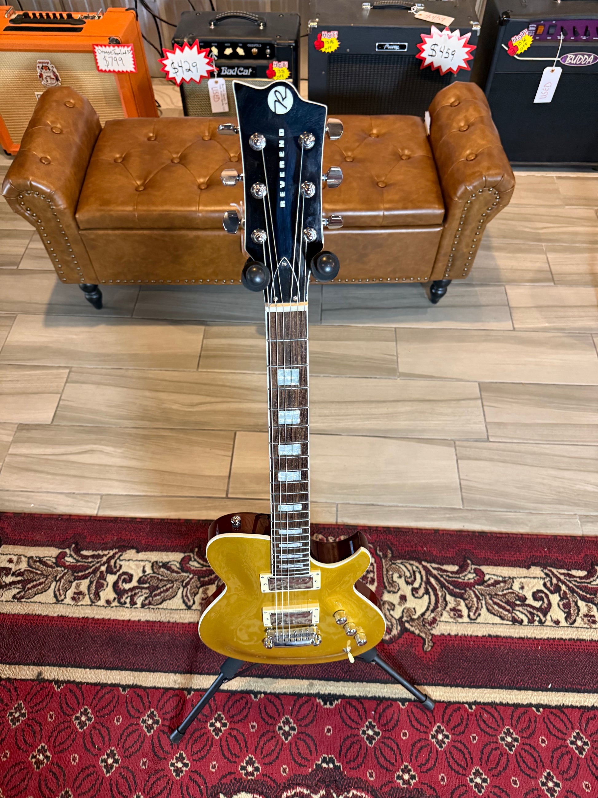 The Roundhouse wallops! The new Roundhouse is the classic single cutaway reimagined for today’s player. This carved top set neck – a first for Reverend Guitars — has a massive tone but is lightweight and balanced. Every Roundhouse features Reverend’s HA5 humbuckers, a TOM stop-tail bridge, rosewood fretboards, and no pickguards. Perfect for all your rock-and-roll dreams!